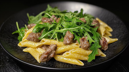 A photorealistic close-up of penne with sausage and arugula, presented on a black plate for contrast