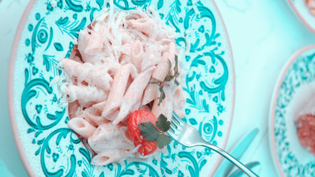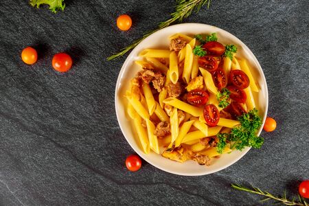 Pasta plate top view, macaroni with cherry tomato, salad and parmesan cheese. Close up food photo