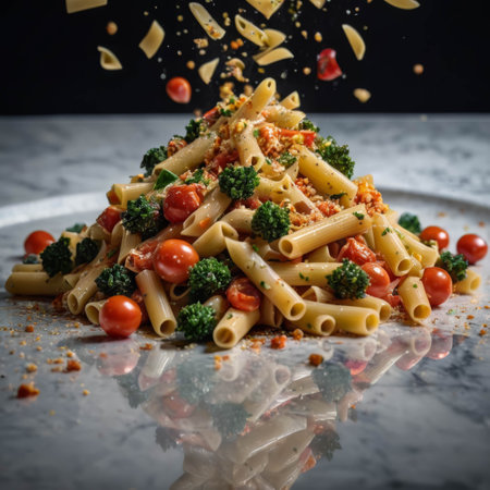 Italian pasta mixed with vegetables spilled on table, very tasty. Abstract