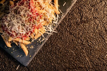 delicious appetizing classic macaroni pasta with tomato sauce, parmesan cheese and fresh basil, top view