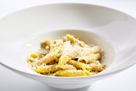 Delicious penne with cheese and truffle oil closeup. Traditional italian cuisine restaurant menu item. Tasty mediterranean dish isolated on white background. Macaroni with parmesan close up