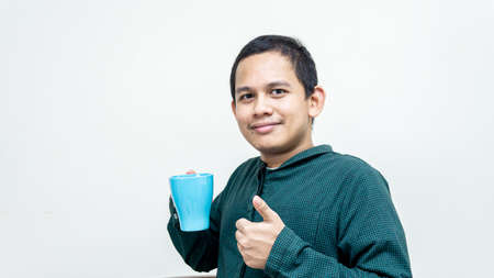 A portrait of Asian Malay man smiling and showing cheers gesture and thumbs up with the blue tea cup on his hand. Good attention.