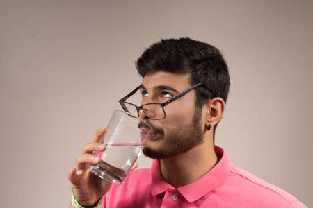 young man with glasses drinking water from a transparent glass