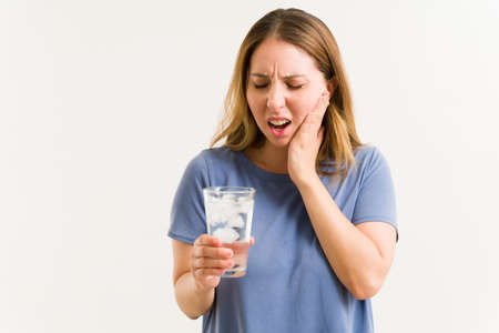 Distressed young woman rubbing her face and suffering of tooth sensitivity because after drinking a glass of cold water