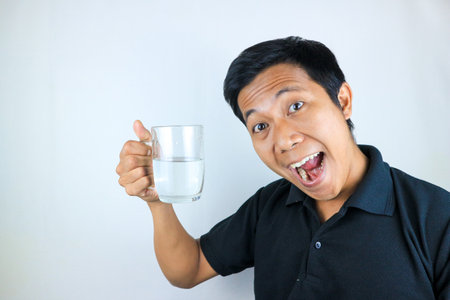 smiling face expression young asian man hold drinking glass. healthcare concept