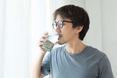 Middle age Asian man in grey t-shirt drink water by the window at home.