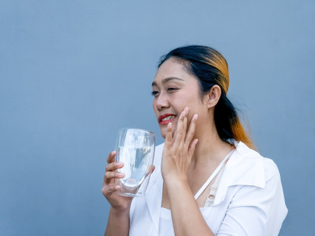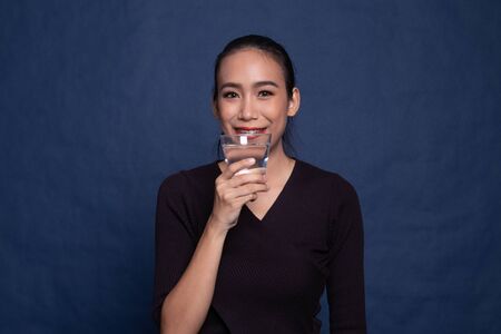 Young Asian woman with a glass of drinking water on blue background