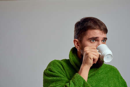 Man in a green robe with a cup of drink in his hands on a gray background cropped view