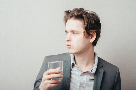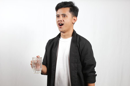 Young Asian man with a glass of water on a white background.