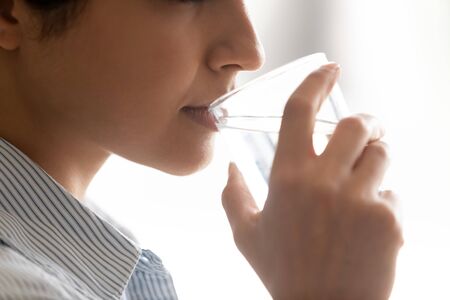 Cropped side close up view millennial indian woman drinking pure stilled water. Young mixed race girl taking care of health, preventing dehydration, keeping detox weight loss diet, healthy habit.