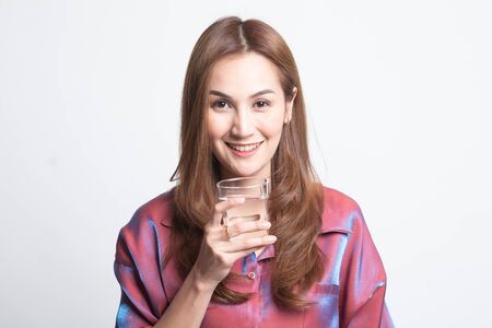 Young Asian woman with a glass of drinking water on white background