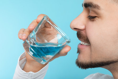 Woman's hand pouring mouthwash from bottle into glass on blue background. Oral hygiene routine for freshness breath,