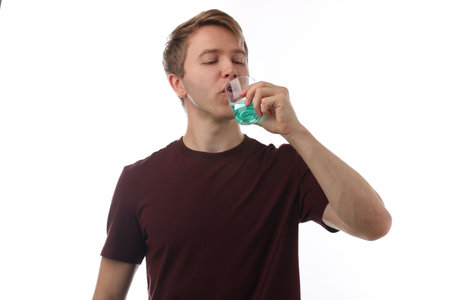 Man rinsing mouth with mouthwash on white background. Oral hygiene