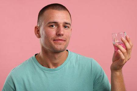 Man with glass of mouthwash on pink background
