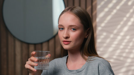 Healthy woman Caucasian happy female girl in home bathroom smile drink glass water thirst body care look camera drinking refresh moisturize skin hydration balance beauty skincare health diet vitamins