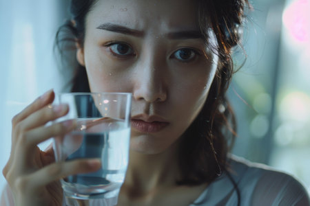 A woman is holding a glass of water and looking at the camera. She is sad or upset