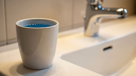 A white ceramic mug filled with a vibrant blue liquid sits on a pristine white sink. The mug is positioned near a modern chrome faucet, with the background featuring a simple, minimalist design. The lighting is soft, casting gentle shadows and highlighting the smooth surfaces of the mug and sink.