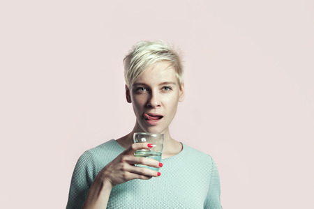 Portrait of blonde woman with glass of water, short hair, bright background