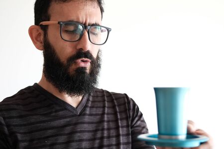 Close-up of a man looking in his mug in amazement.