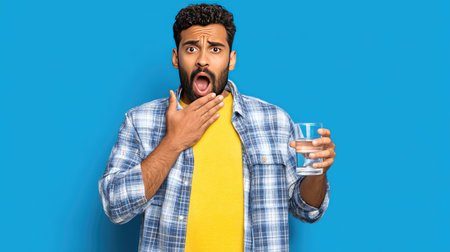 A young man displays a shocked expression while holding a glass of water. His vibrant yellow shirt and plaid shirt create a lively contrast against the blue backdrop.