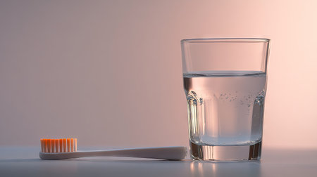 A close-up of a toothbrush and a clear glass of water, showcasing details of both items against a neutral backdrop.