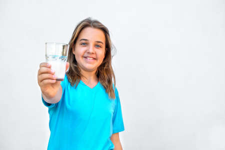 Teenage girl holds out a glass of milk with a smile