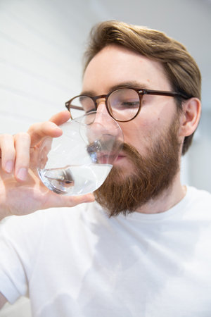 Portrait of a young handsome adult man in a white t-shirt, drinking a glass of pure water, close-up on a glass. A healthy life concept, modern interior in a background.