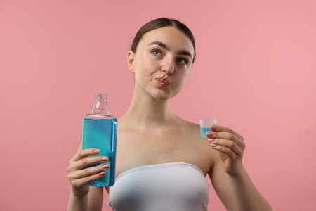 Woman rinsing mouth with mouthwash on pink background. Oral hygiene