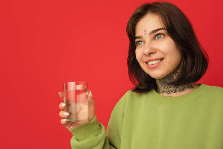 Drinks pure water. Caucasian womans portrait isolated on red background with copyspace. Beautiful female model in green hoodie. Concept of human emotions, facial expression, sales, ad, fashion.
