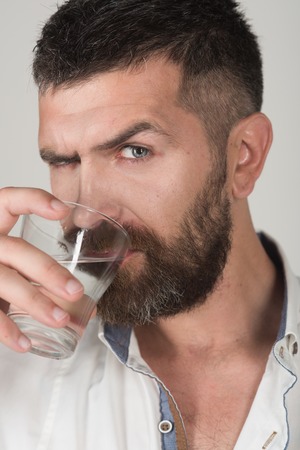 Life source and healthcare. Hangover and thirst. Man with long beard hold water glass on grey background. Hipster drink clean healthy water, refreshing. Health and dieting.