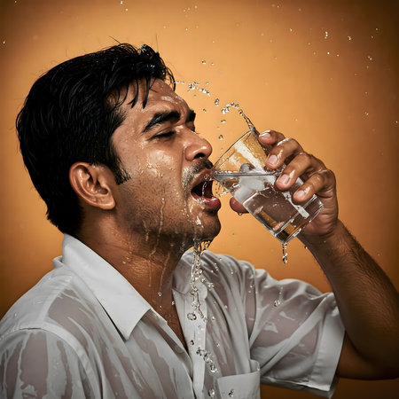 Thirst Quenching Drink: A man felt refreshed when he drank cold water from a thirsty gulp. The cold water splashed down his face and down his shirt. It was a refreshing, cooling sensation.