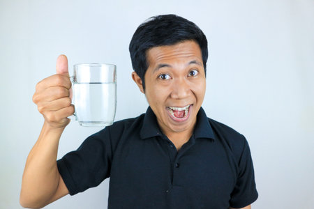 smiling face expression young asian man hold drinking glass. healthcare concept
