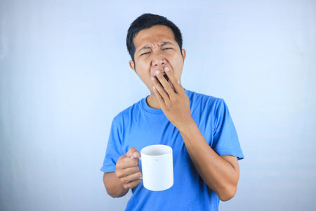 Portrait of sleepy young men yawning and holding coffee cup, isolated on white background