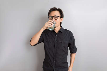 Asian man with glasses of water wearing black shirt drink fresh water stand on grey background.