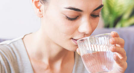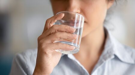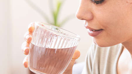 Healthy young lady drinking fresh clean transparent pure filtered mineral water, thirsty woman holding glass in hand hydrating thirst, everyday good habit for body wellness concept, close up view