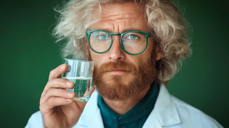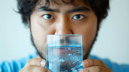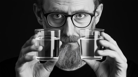 Man holding two glasses of water, contrasting clarity and perception in a minimalist setting
