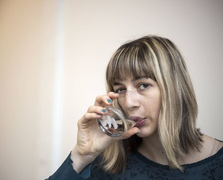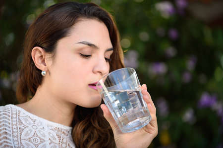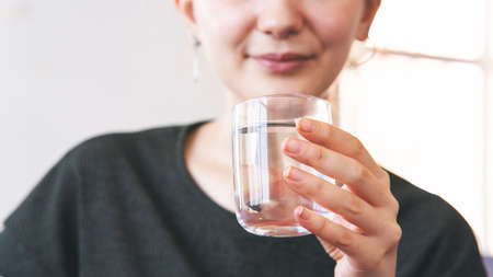Woman holding transparent glass in her hand and drinking water. focus eye