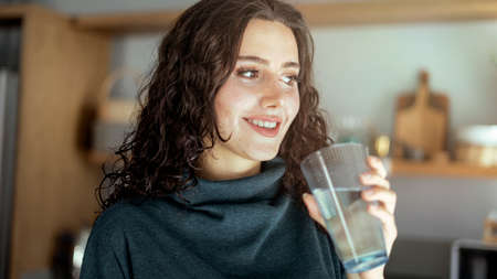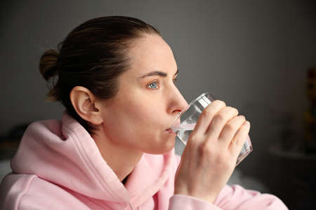 Woman drinks still water close up portrait. Quench thirst, water balance and weight control, caring of skin and body, hangover relief, body refreshment, energy recovery, dehydration prevention concept