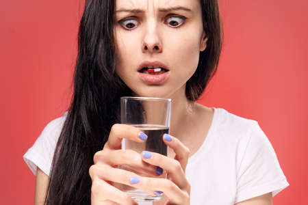 Woman sick, health, pill, glass of water, woman with pill and glass of water, woman on red background.