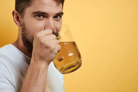 Man with a mug of beer fun alcohol lifestyle white t-shirt yellow isolated background
