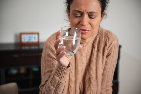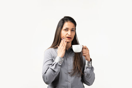 Mid aged Indian woman suffering toothache, sensitive teeth, feels pain after drinking cold beverage