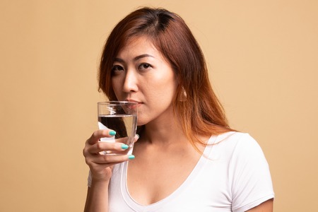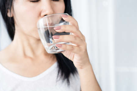Young Asian woman drinking pure water with ice from glass. Female drinking from a glass of water. Health care concept