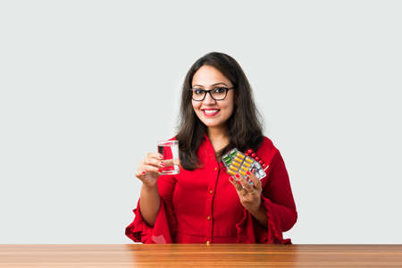 Indian asian young woman checking temperature with thermometer or oxygen level using oximeter or taking medicines