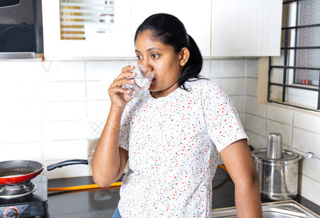 indian woman drinking water from glass in kitchen at home and looking at camera
