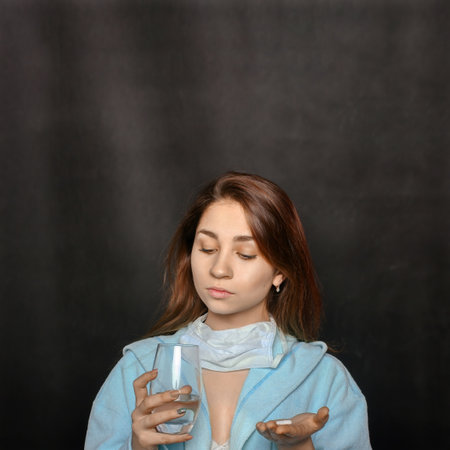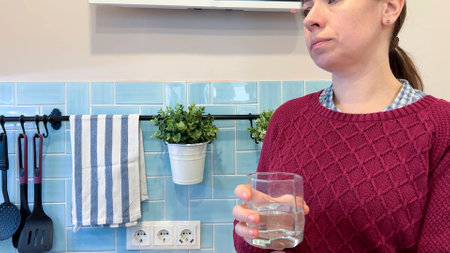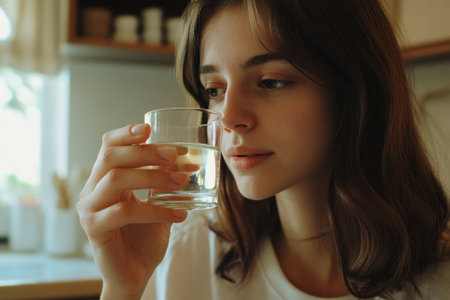 A woman takes care of her health by washing down pills or vitamins with water, maintaining her wellness routine