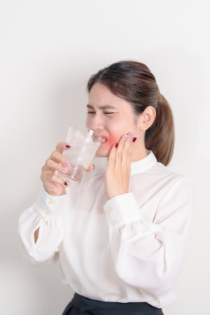 Business woman having toothache and pain after drink ice water for concept of Teeth Sensitive to Cold, Tooth Decay and Gum Disease, Grinding Teeth and Stress, Exposed Nerve Roots, Crack and Receding