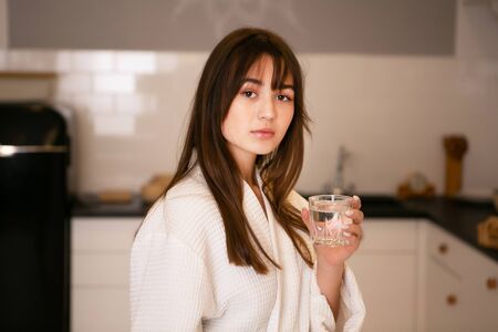 Caucasian healthy beauty routine pretty woman female lady girl in home hotel bathroom health care drinking water holding glass of aqua balance good habit refresh moisturize organism diet nutrition