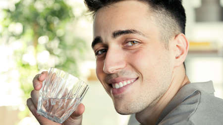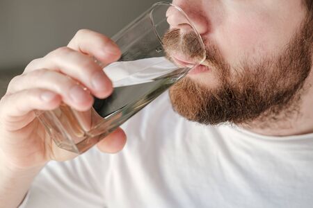 Close up of a bearded man drinking fresh, clean water from a glass. Health concept.