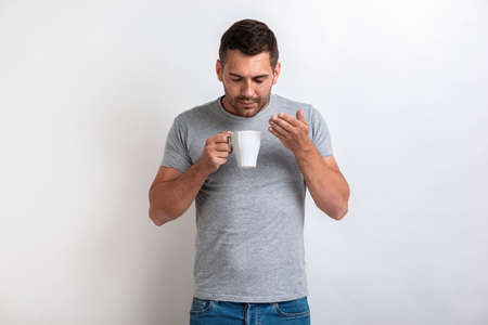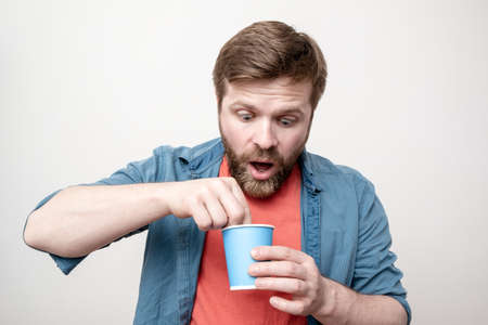 Shocked man with a paper cup in hand takes something out of freshly drunk tea with surprise. Concept of poor quality products.