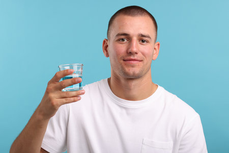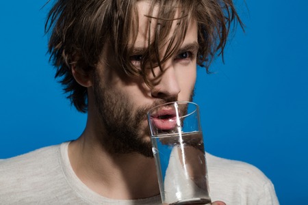 Man drink medicine drug with water from glass. Health and medicine. Treatment and painkiller. Guy hold water glass. Drug and antidepressant.